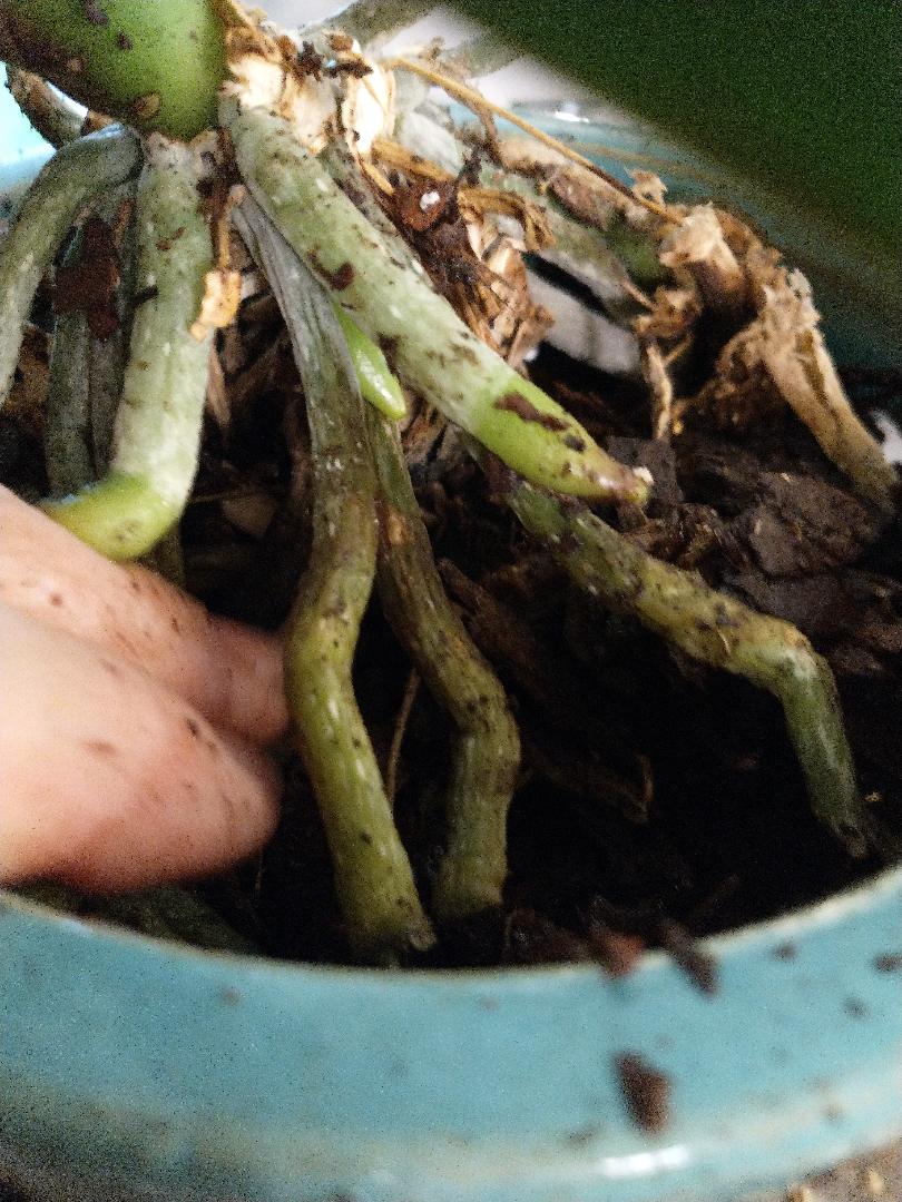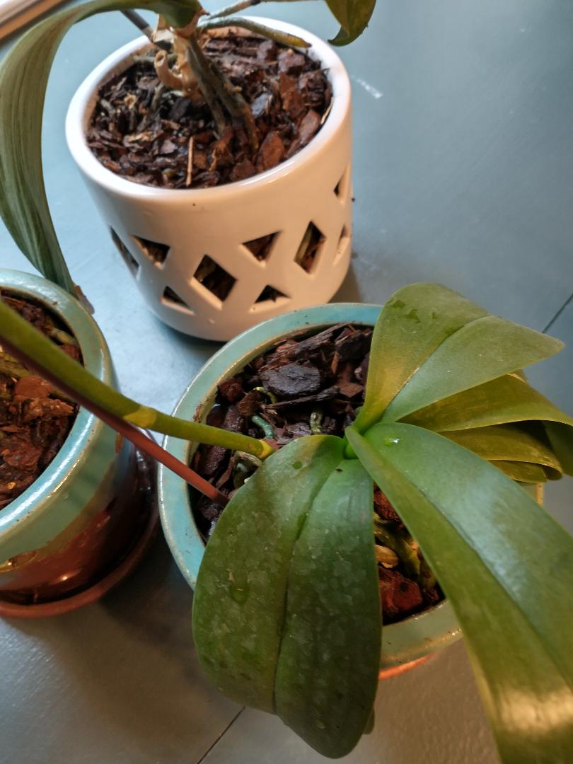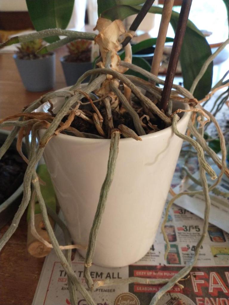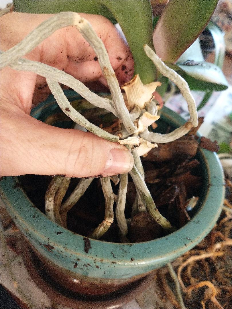 In assessing my indoor plants, I also found several of my orchids needed new pots and a good trim. This little orchid had come in a small pot and was totally root bound. Orchid roots need room to spread out.