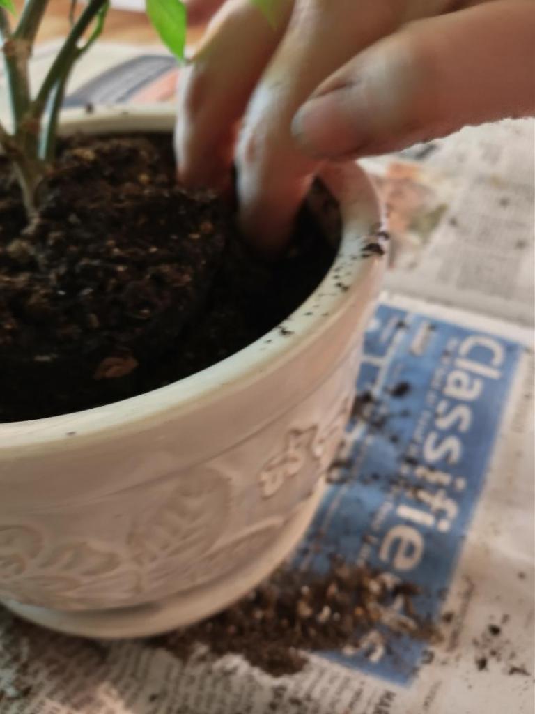 To repot a plant: Choose a container a size or several sizes larger around and deeper. Add good-quality potting soil at the bottom of the new container (there are many good potting soils available; here I do not have a strong preference). Carefully remove the plant from its current container. Place the plant in the center. Add soil around the plant, filling the new container. Water thoroughly initially, then continue with your normal watering schedule.