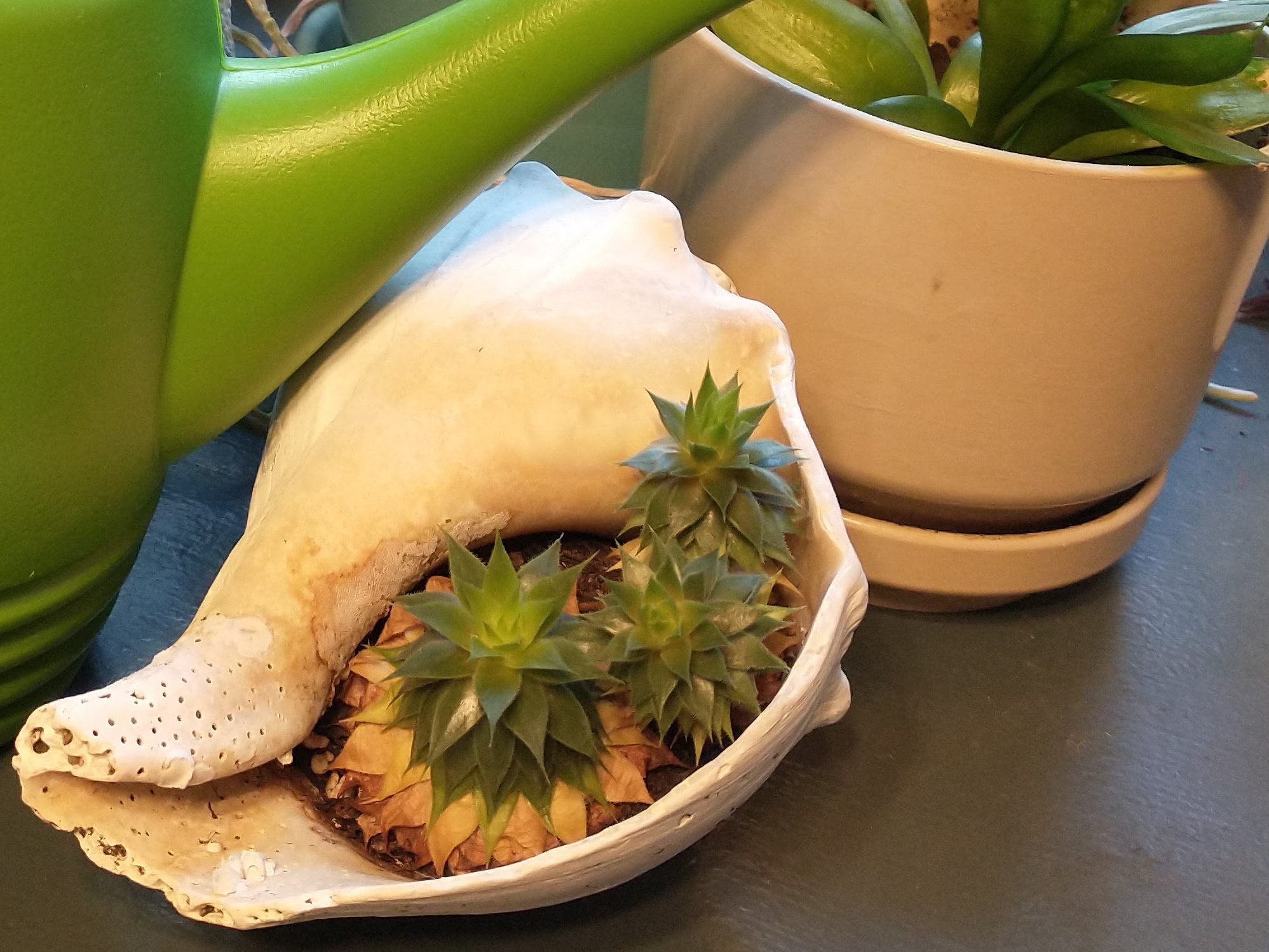 With some plants, you can get creative, like this “baby chick” from a sempervivum plant (hens and chicks) that I transplanted into a shell.